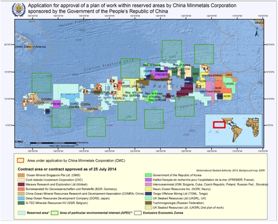 國際海底管理局理事會于牙買加當地時間2015年7月20日通過了中國五礦集團公司(簡稱:中國五礦)提出的太平洋多金屬結核礦區(申請區域位于東太平洋克拉里昂-克利珀頓斷裂區,表面積為72740平方公里)勘探申請。至此,中國五礦成為我國首個擁有國際海底礦產資源勘探權的企業,也讓我國獲得了第四塊國際海底專屬勘探礦區。