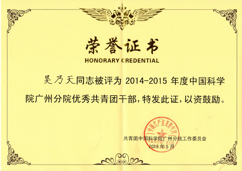 為進一步推進中國科學院廣州分院基層團組織的各項建設,增強團組織的凝聚力和戰斗力,引導團員、團干部積極投身實施 “率先行動”計劃,廣州分院團工委在“五四青年節”期間,表彰一批2014~2015年度廣州分院“五四紅旗團組織”、優秀團干部和優秀團員。深海所團總支部被評為“2014~2015年度中國科學院廣州分院五四紅旗團組織”,吳乃天同志被評為“2014~2015年度中國科學院廣州分院優秀共青團干部”。