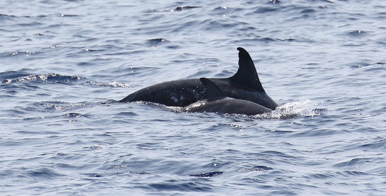 航次采用目視考察手段、截線抽樣方法,在海南島東南海域陸坡區(qū)域進行科學考察,以了解該區(qū)域深潛和遠海性鯨類物種組成、空間分布和行為特征。考察過程中,科考隊員在南海北部海域發(fā)現了大量的鯨類動物,一共目擊到深潛和遠海性鯨類動物27群次,其中可確定的深潛鯨類物種4種,分別為抹香鯨、柯氏喙鯨、短肢領航鯨、花紋鯨(瑞氏海豚);遠海性海豚物種3種,分別為熱帶斑海豚、條紋海豚、弗氏海豚。另有2個物種還有待進一步確定。考察結果顯示,考察海域目前擁有較高的深潛和遠海性鯨類物種多樣性;除熱帶斑海豚外,其它動物群體均是科研人員在考察海域的首次發(fā)現和記錄;其中,抹香鯨和喙鯨群體都觀察到母子對,表明南海北部考察海域極有可能存在抹香鯨和喙鯨的定居群體。這些發(fā)現填補了南海鯨類尤其是南海深潛鯨類研究的空白。