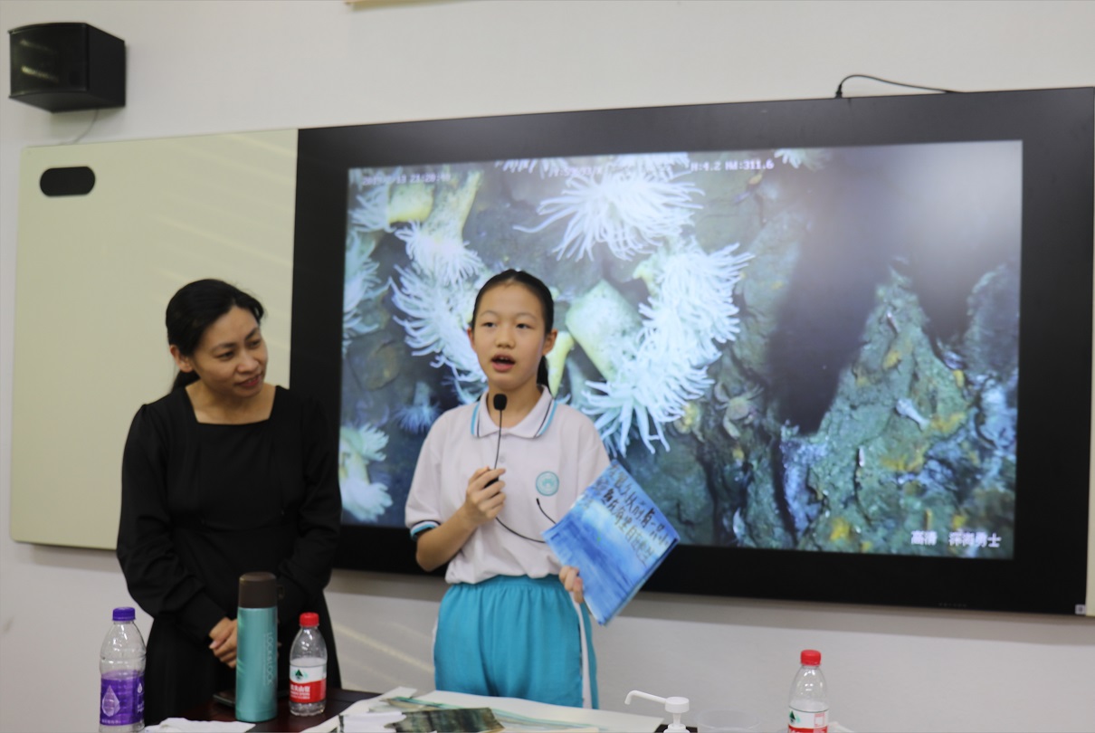 首先,來自深海所地外海洋系統研究室劉翠艷研究員為同學們開展生動的科普宣講,以幻燈片展示、現場交流互動以及視頻介紹等方式通俗易懂地傳授生命的豐富形式、講述海洋故事,科普深海知識,宣教“地外海洋”概念,提升海洋文化的親和力、感召力與影響力。同學們聽得津津有味,受益匪淺。在隨后的藝術創作環節,活動特邀藝術家Angelo Segarra先生作為現場美術指導,引導學生們繪制圖冊來編寫一個科學性或科幻性的海洋故事。活動中,學生們認真作畫,在水彩描繪的背景上勾畫出海洋中的珊瑚、水草、魚、蝦、蟹、水母、鯨魚等海洋生物,呈現他們腦海中的海洋故事。活動最后,學生們現場分享自己的作品:初一的陳雅昀同學生動形象地繪制了海洋中危險環境,提醒大家要敬畏海洋,不要到危險未知區域玩耍;李雅倩同學則描繪了一只誤吞塑料袋的小鯨魚痛苦地向人類呼救,呼吁大家保護海洋環境,重視海洋污染;簡玉萱同學則用擬人的手法編寫了一個小螃蟹和小鰻魚斗智斗勇的故事。活動結束后,同學們紛紛表示對深海科學、海洋生態保護以及地外海洋的探索產生了濃厚的興趣。