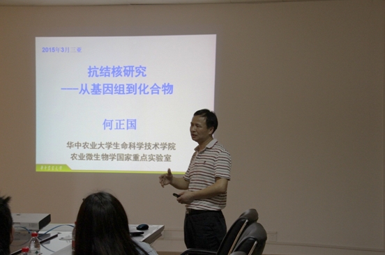3月30日,應韓壯博士邀請,華中農(nóng)業(yè)大學何正國教授到訪三亞深海所,并做了題為“抗結(jié)核研究---從基因組到化合物”的學術(shù)報告。