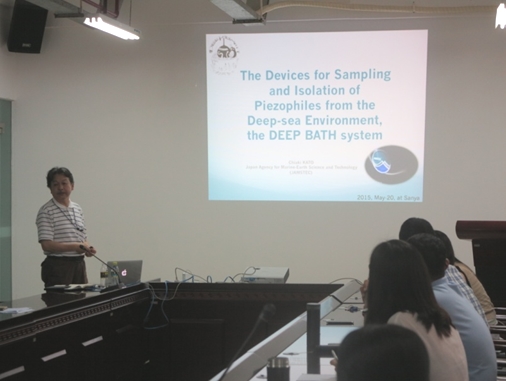 520日,日本海洋科學技術中心Dr.KATO訪問中科院三亞深海科學與工程研究所(籌),并做了題為“深海環境中嗜壓微生物的分離培養及采樣設備介紹”(The Devices for Sampling and Isolation of Piezophiles from the Deep-sea Environment, the DEEP BATH System)的學術報告。