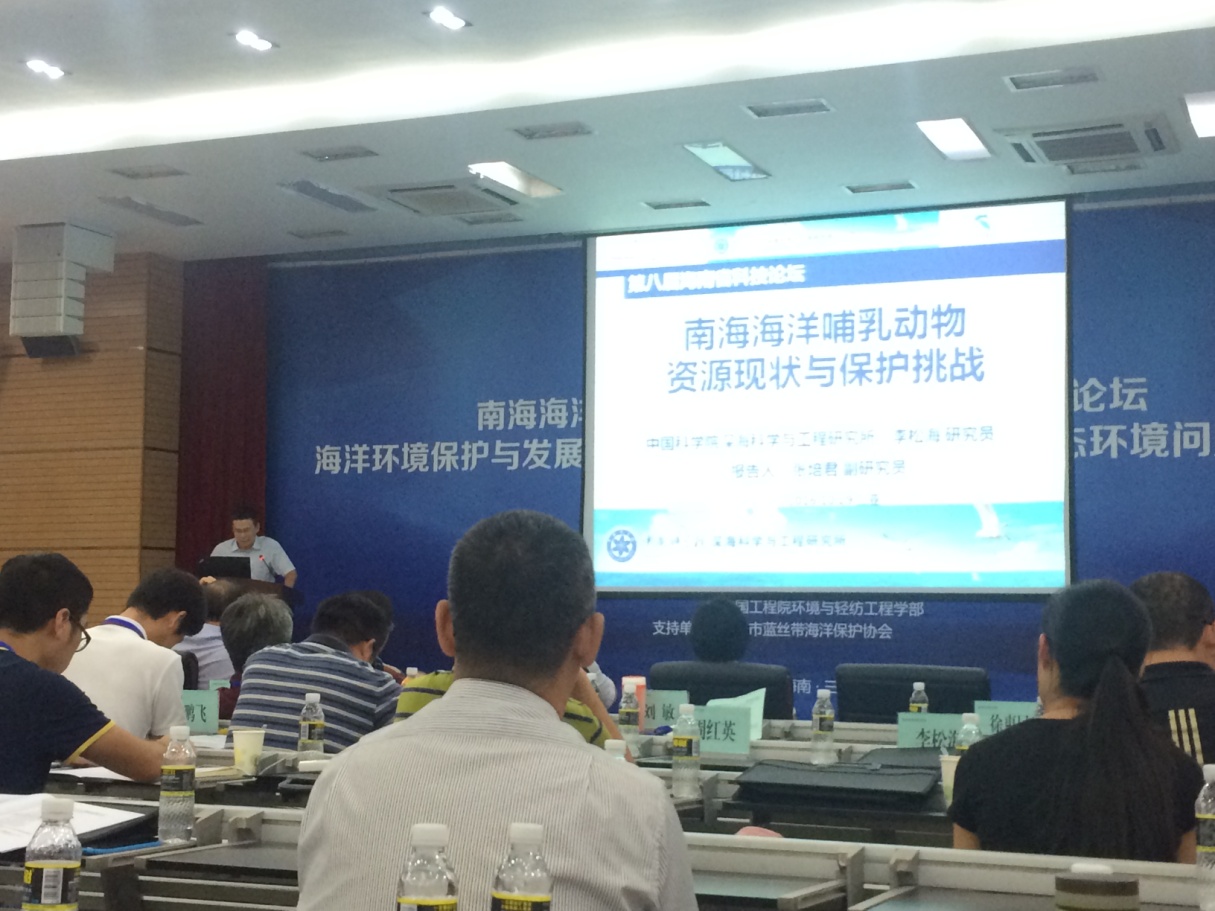 20161029日深海所海洋哺乳動物與海洋生物聲學研究組受邀參加南海海洋科技論壇暨第八屆海南省科技論壇海洋環境保護與發展分論壇。張培君博士參加了本次會議并做了題為“南海海洋哺乳動物資源現狀與保護挑戰”的報告。此外,海洋哺乳動物與海洋生物聲學研究組還協助開展了主題為“保護海洋關注水生野生動物”的科普知識圖片展,引起來與會專家以及同學的廣泛關注。