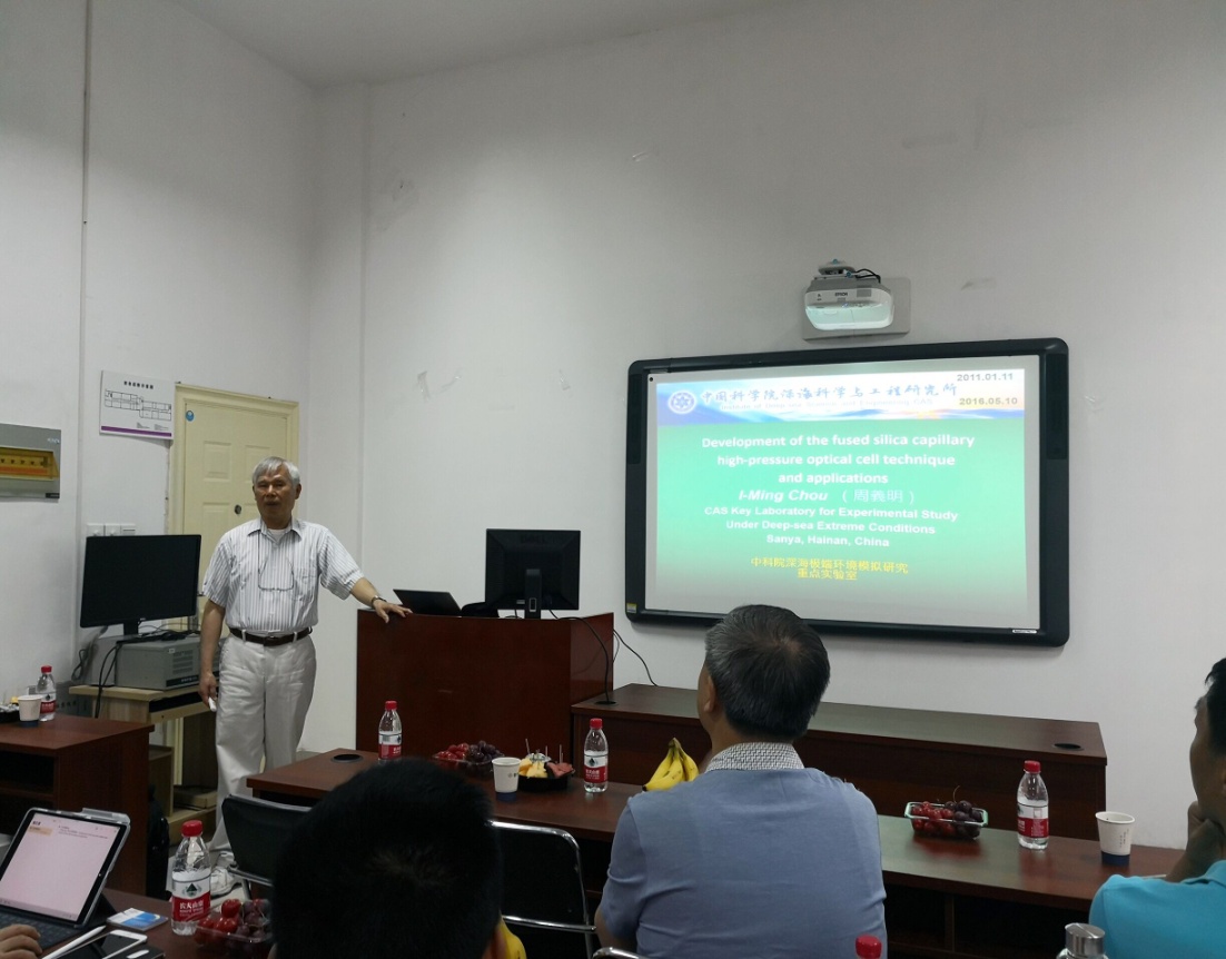 報告中,周義明研究員介紹了高壓微型可視毛細(xì)硅管與拉曼光譜聯(lián)用技術(shù)的研發(fā)歷史背景及多位從中國到美國地質(zhì)調(diào)查局其實(shí)驗(yàn)室參與初期研發(fā)工作的訪問學(xué)者的貢獻(xiàn),同時也介紹了目前在深海極端環(huán)境模擬研究實(shí)驗(yàn)室的主要工作內(nèi)容及面對的挑戰(zhàn)和前景。目前,此高壓微型可視毛細(xì)硅管與拉曼光譜聯(lián)用技術(shù)已被廣泛的應(yīng)用到與地質(zhì)及環(huán)保相關(guān)的流體研究,主要包括在中國、美國、加拿大、法國、及澳大利亞的科研機(jī)構(gòu)。其他多位與會者及前訪問學(xué)者也介紹了他們在這方面的科研進(jìn)展并熱烈地參與交流討論。