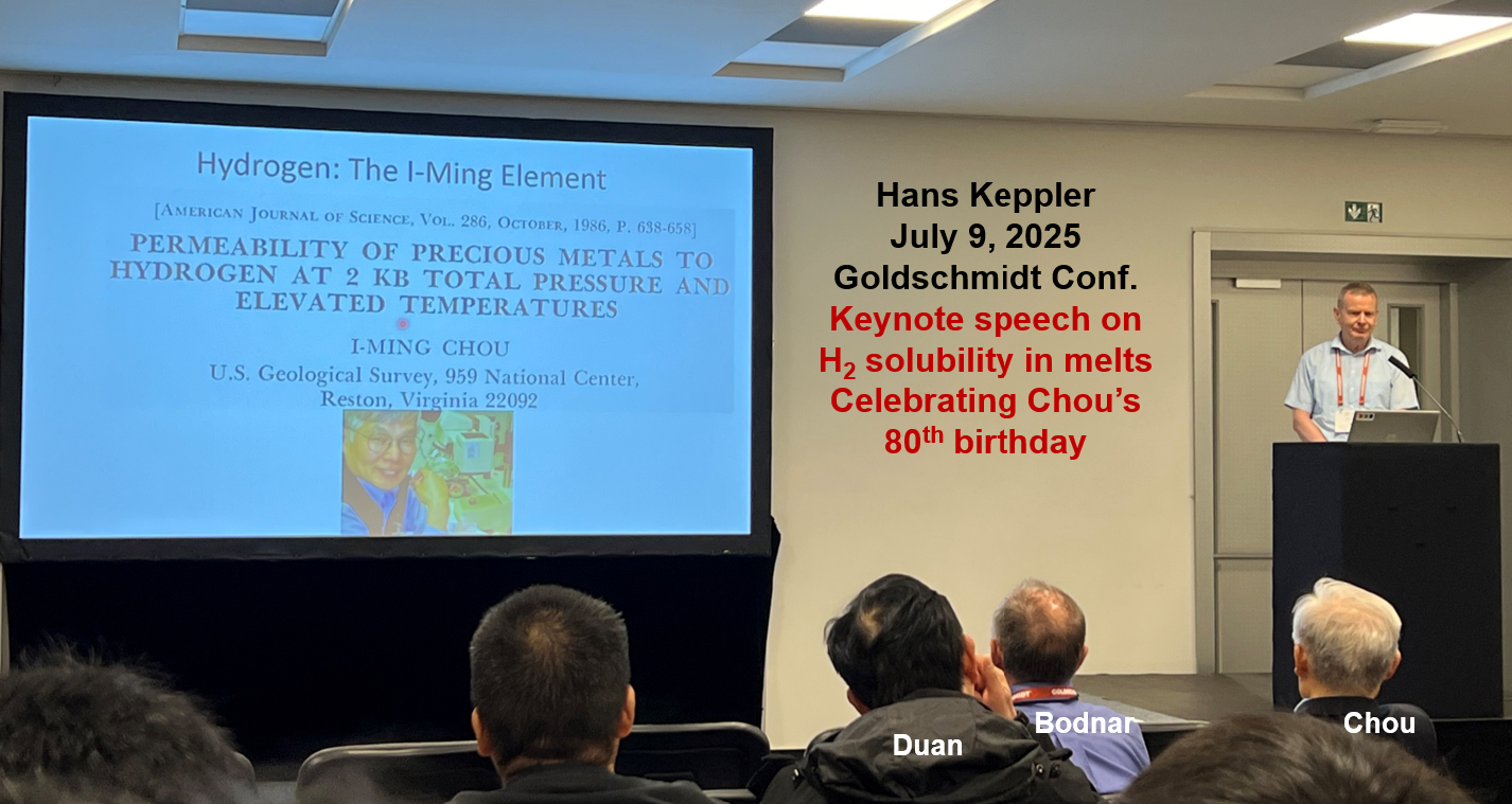 本屆大會(huì)參會(huì)人數(shù)規(guī)模達(dá)到4400人,還特別設(shè)立了專題分會(huì)(Session 02n)。該專題分會(huì)由六位國內(nèi)外學(xué)者共同發(fā)起,共收到50余份摘要,旨在致敬我所周義明研究員在實(shí)驗(yàn)地球化學(xué)領(lǐng)域做出的卓越貢獻(xiàn)。德國拜伊羅特大學(xué)高壓實(shí)驗(yàn)中心(Bayerisches Geoinstitut)原所長Hans Keppler教授在主旨報(bào)告中將氫稱之為“I-Ming Element”,高度評(píng)價(jià)了周義明研究員在高溫高壓實(shí)驗(yàn)中氧逸度控制與測量技術(shù)上的引領(lǐng)貢獻(xiàn)。特邀報(bào)告人包括美國國家科學(xué)院院士、弗吉尼亞理工大學(xué)Robert Bodnar教授,德國地球科學(xué)研究中心(GFZ)Christian Schmidt教授,以及巴黎地球物理研究所(IPGP)Razvan Caracas研究員。這一專題不僅彰顯了周義明研究員在國際地球科學(xué)界的學(xué)術(shù)影響力,也為與會(huì)者提供了一個(gè)深入探討礦物學(xué)、礦床學(xué)、巖石學(xué)以及深海科學(xué)等領(lǐng)域最新進(jìn)展與未來方向的重要平臺(tái),進(jìn)一步促進(jìn)跨學(xué)科的合作與交流。