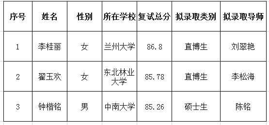 根據(jù)教育部、中國科學(xué)院大學(xué)相關(guān)文件精神,本著“公平公正、全面衡量、保證質(zhì)量、寧缺毋濫”的原則,通過對考生面試、政審以及體檢等綜合考核,經(jīng)深海所招生工作領(lǐng)導(dǎo)小組審核批準(zhǔn),李桂麗、翟玉歡2位同學(xué)根據(jù)本人申請并通過考核,被擬錄取為深海所推薦免試直博生、鐘楷銘同學(xué)被擬錄取為深海所推薦免試碩士研究生?,F(xiàn)將擬錄取名單予以公示,公示期十個工作日。