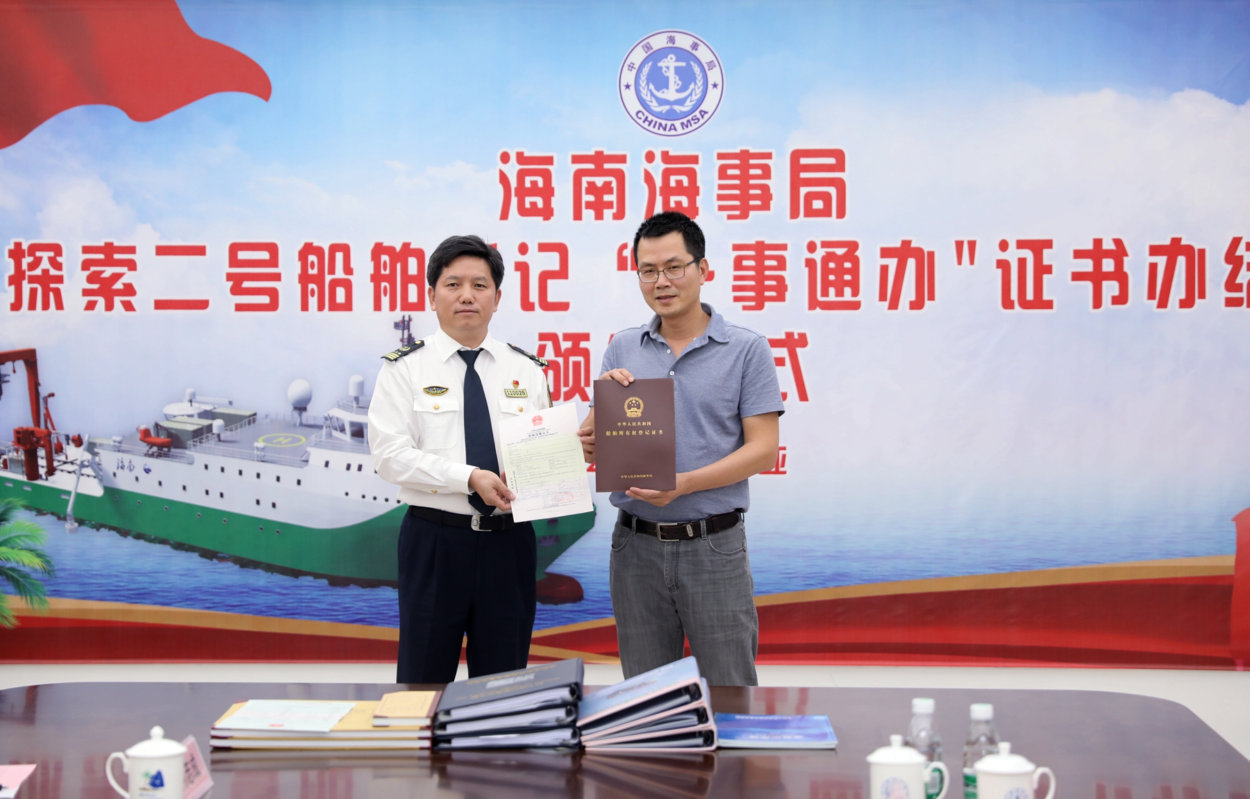 深海所“探索二號(hào)”科考船在海南獲得“身份”證明