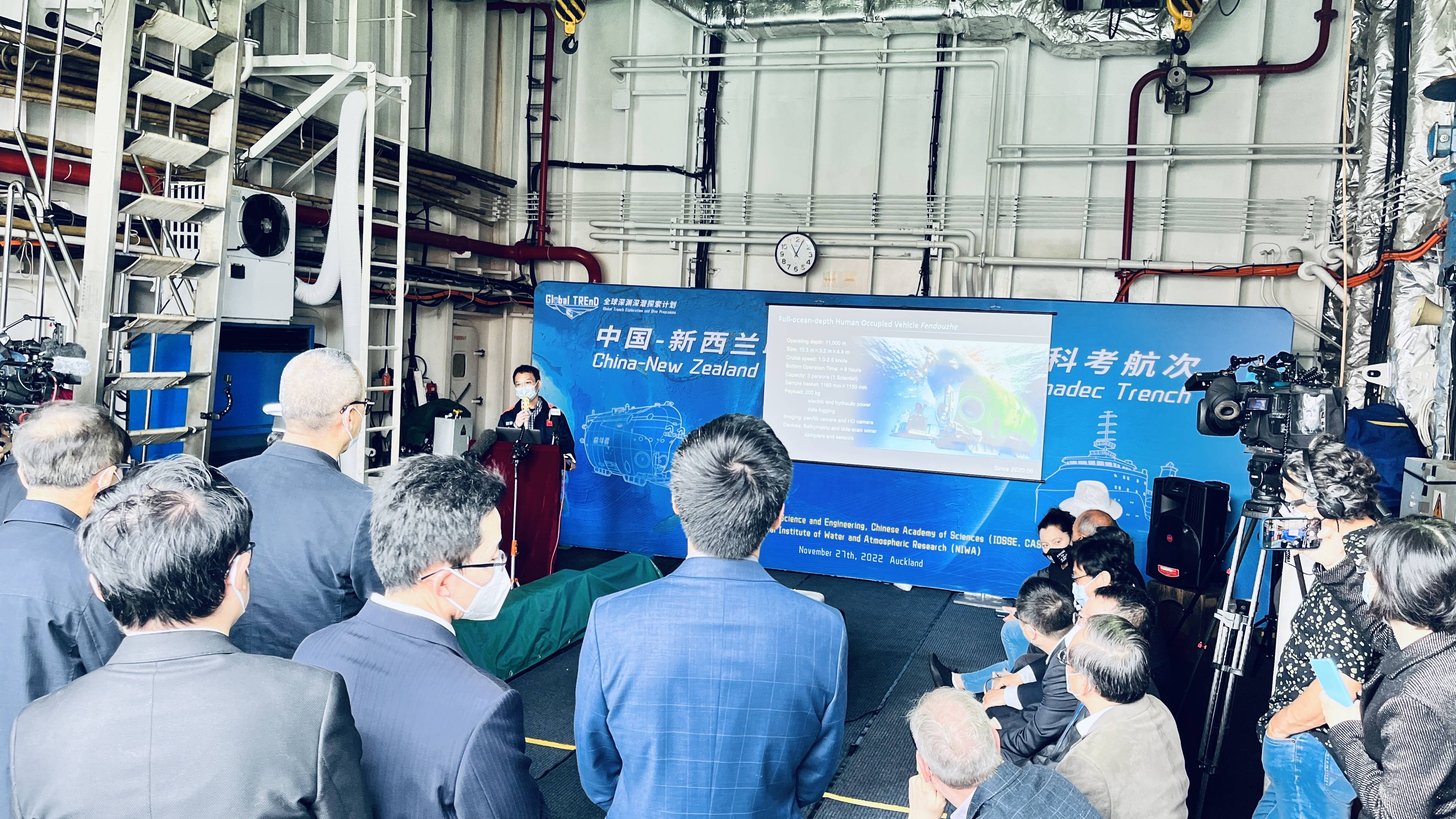 11月27日,中-新聯(lián)合深淵深潛科考隊(duì)在探索一號母船召開航次招待會。航次領(lǐng)隊(duì)兼首席科學(xué)家彭曉彤研究員介紹航次實(shí)施情況和成果。中國駐新西蘭大使王小龍、中科院副院長張亞平、NIWA副首席執(zhí)行官Rob Murdoch、深海所副所長陽寧、NIWA研究員Ashley Rowden出席招待會致辭。出席本次活動的還有中國駐奧克蘭總領(lǐng)事陳世杰、奧克蘭博物館首席執(zhí)行官David Gaimster以及新西蘭原住民代表、華人科學(xué)家、知名僑領(lǐng)和中外媒體等。