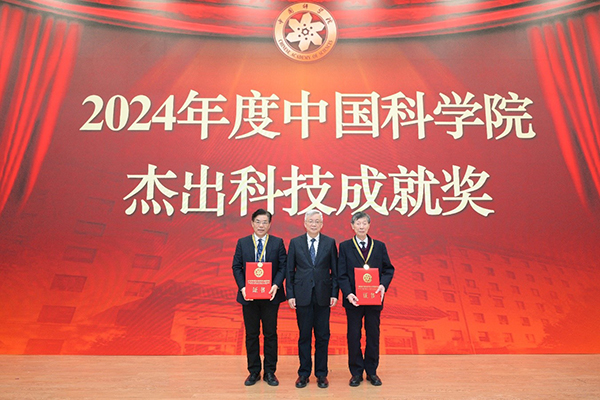 侯建國(guó)為獲得2024年度中國(guó)科學(xué)院杰出科技成就獎(jiǎng)個(gè)人成就獎(jiǎng)的陳立泉院士、陳仙輝院士頒獎(jiǎng)