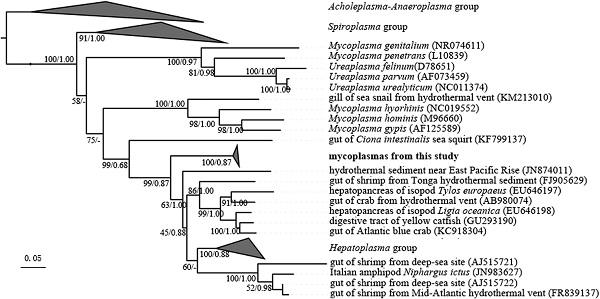 該論文報道了深海等足類食腐性生物大王具足蟲(Bathynomus sp.)的消化中存在高比例共生支原體,此共生支原體為大王具足蟲適應深海的生存環境提供了獨特的代謝通路。該支原體是新物種,并首次在深海生物體內發現,對于研究支原體造成廣泛的人畜疾病的原因具有重要的啟示作用。