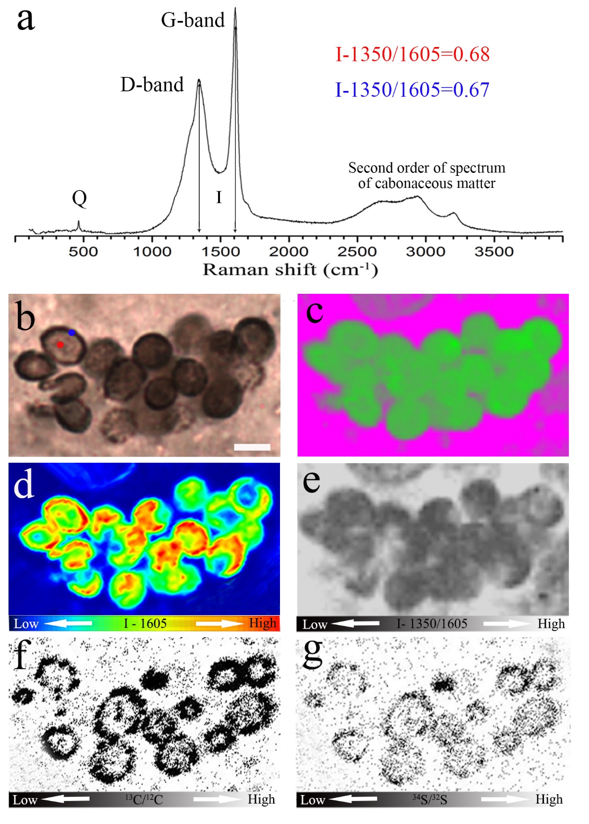 石化藍藻Palaeoanacystis vulgaris的拉曼光譜,以及光學、拉曼、納米二次離子探針圖像。