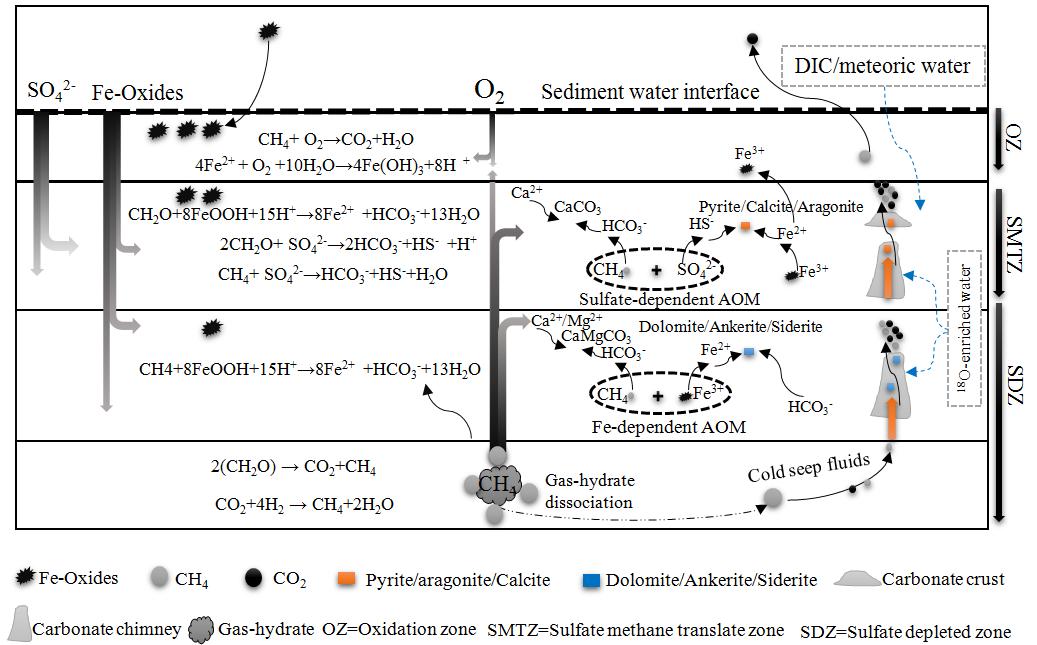 圖1 沖繩海槽沉積柱體不同氧化還原帶中甲烷循環(huán)和冷泉碳酸鹽礦物沉淀模式圖