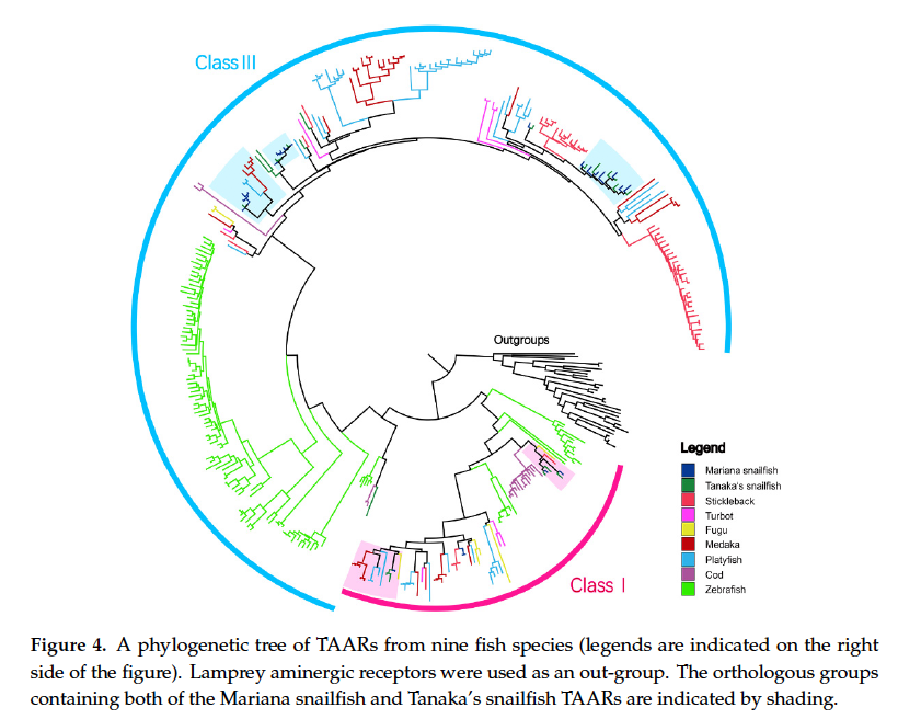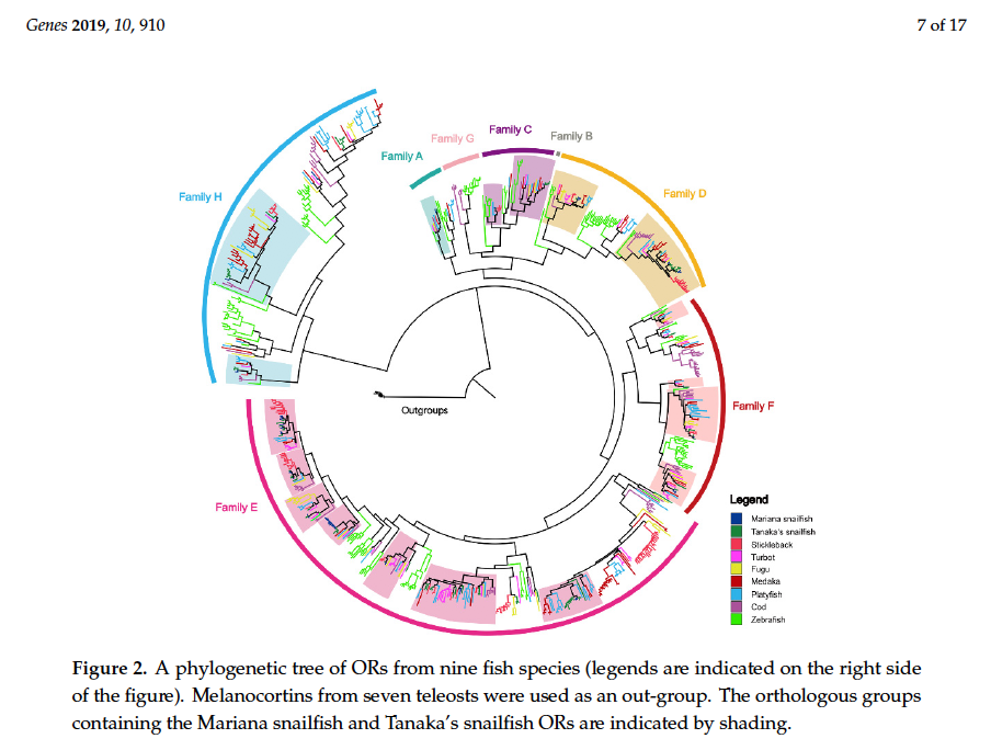 為了探討上述科學問題,中科院何舜平研究員團隊查找并注釋了9種魚類的嗅覺受體(OR)和痕量胺受體(TAAR)基因家族,并重點對比馬里亞納獅子魚與其淺海近緣物種細紋獅子魚之間的差異。研究發(fā)現(xiàn)馬里亞納獅子魚的OR基因家族發(fā)生了大量的丟失,并伴隨著很高比例的假基因化。而TAAR基因家族基因的數(shù)目變化不大。系統(tǒng)發(fā)育分析結果表明,馬里亞納獅子魚和細紋獅子魚嗅覺基因家族的組成高度保守。同細紋獅子魚相比,馬里亞納獅子魚OR基因家族的亞家族數(shù)量相近,但每個亞家族中的OR基因數(shù)目明顯減少,而TAAR基因家族的亞家族數(shù)目發(fā)生減少,但亞家族中的TAAR數(shù)量增加。盡管馬里亞納獅子魚OR亞家族普遍是收縮的,仍發(fā)現(xiàn)有個別亞家族發(fā)生擴張,這種亞家族間獨立的進化歷程反映了不同OR亞家族基因在深淵生態(tài)環(huán)境中面臨獨立的選擇壓力。進一步的進化選擇壓力的分析顯示,OR基因在馬里亞納獅子魚中發(fā)生了松弛選擇,其功能依賴性降低。而TAAR基因則受到正選擇作用,這表明TAAR基因在馬里亞納獅子魚適應深淵生態(tài)環(huán)境中仍具有重要的作用,符合其能夠迅速感知動物腐敗后釋放的胺的現(xiàn)象。這項研究首次揭示了馬里亞納獅子魚在占據(jù)深淵環(huán)境中嗅覺發(fā)生了簡單但專一的適應性進化歷程,為進一步了解深淵中生物的生態(tài)適應提供了重要的基礎和見解。