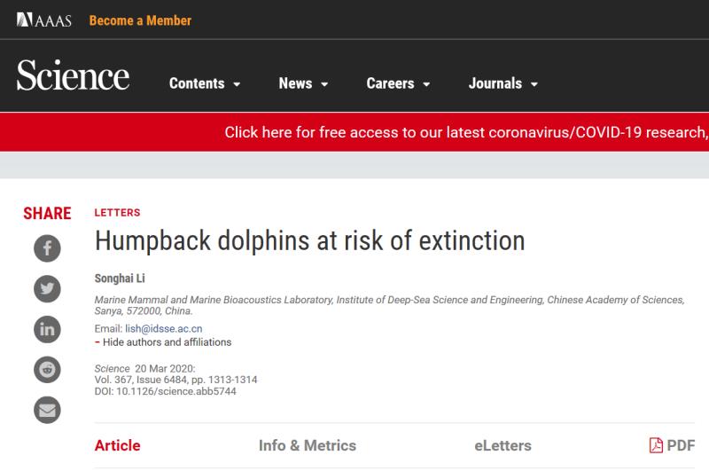 近期,深海所李松海研究員在《Science》期刊上發(fā)表題為“Humpback dolphins at risk of extinction”的Letter文章。文章結(jié)合其研究團(tuán)隊的相關(guān)科研成果和認(rèn)識,提出中華白海豚等駝海豚屬動物正面臨滅絕的風(fēng)險,呼吁關(guān)注這些動物所面臨的生存威脅,并提出了相關(guān)的保護(hù)建議以阻止該類珍稀動物的滅絕。