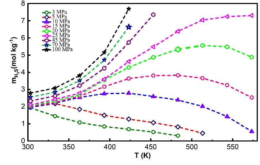1)基于拉曼光譜和高壓可視反應腔實驗平臺,建立了硫化氫在純水中濃度的定量分析方法,系統測定了廣域溫壓范圍內(303.15<T<573.15 K, P<100 MPa) 硫化氫在純水中的溶解度,拓展了前人的數據范圍;以新獲取的實驗數據為基礎,優化了硫化氫溶解度的計算模型。