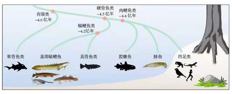 包括人類在內的陸生脊椎動物(也稱四足動物)的祖先是由魚類在四億年前從海洋走向陸地進化而來的。這一過程需要在呼吸系統、運動系統、神經系統等方面進行各種生理和形態的革新,才能實現水生到陸生的轉變。經過長期的古生物學和脊椎動物學的研究,已知現在還在活著的四足動物的魚類近親是肺魚。肺魚和四足動物屬于肉鰭魚類,與常見的各種魚所在的輻鰭魚類一起被統稱為硬骨魚類。然而,從硬骨魚祖先到肉鰭魚祖先再到陸生脊椎動物各種進化改變的遺傳創新基礎是什么,一直是科學界懸而未決的重大科學問題。解析肺魚和早期輻鰭魚類這些“活化石”魚類的基因組是解決這一重大問題的關鍵。