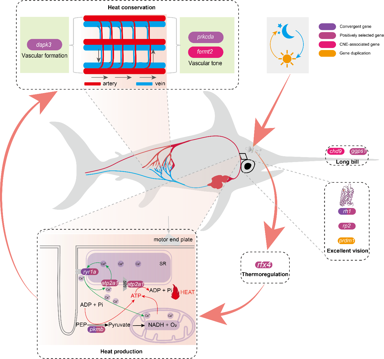 為了應對水體快速散熱的特點,水生恒溫動物通常具有一個獨特的逆流交換器,用于溫度的保存和傳遞。劍魚和旗魚中存在著由動脈和靜脈血管平行排列,血流方向完全相反的血管網絡系統。在對劍魚和旗魚的同源基因分析中,發現存在著9個顯著受到了正選擇的基因,其中有三個基因 (dapk3, prkcda和rfx4) 的存在較大的氨基酸改變。其中dapk3是脊椎動物動物平滑肌收縮調控的重要因子,該基因可能參與了血管網絡的形成;prkcda是調控血管張力的重要基因,該基因可能促進了逆流交換器更好的實現熱量的保存和傳遞。而Rfx4高表達于哺乳動物視交叉上核,對晝夜變化和溫度刺激具有調控作用。劍魚和旗魚中該基因的顯著改變表明視交叉上核可能對它們也具有關鍵的調節作用。