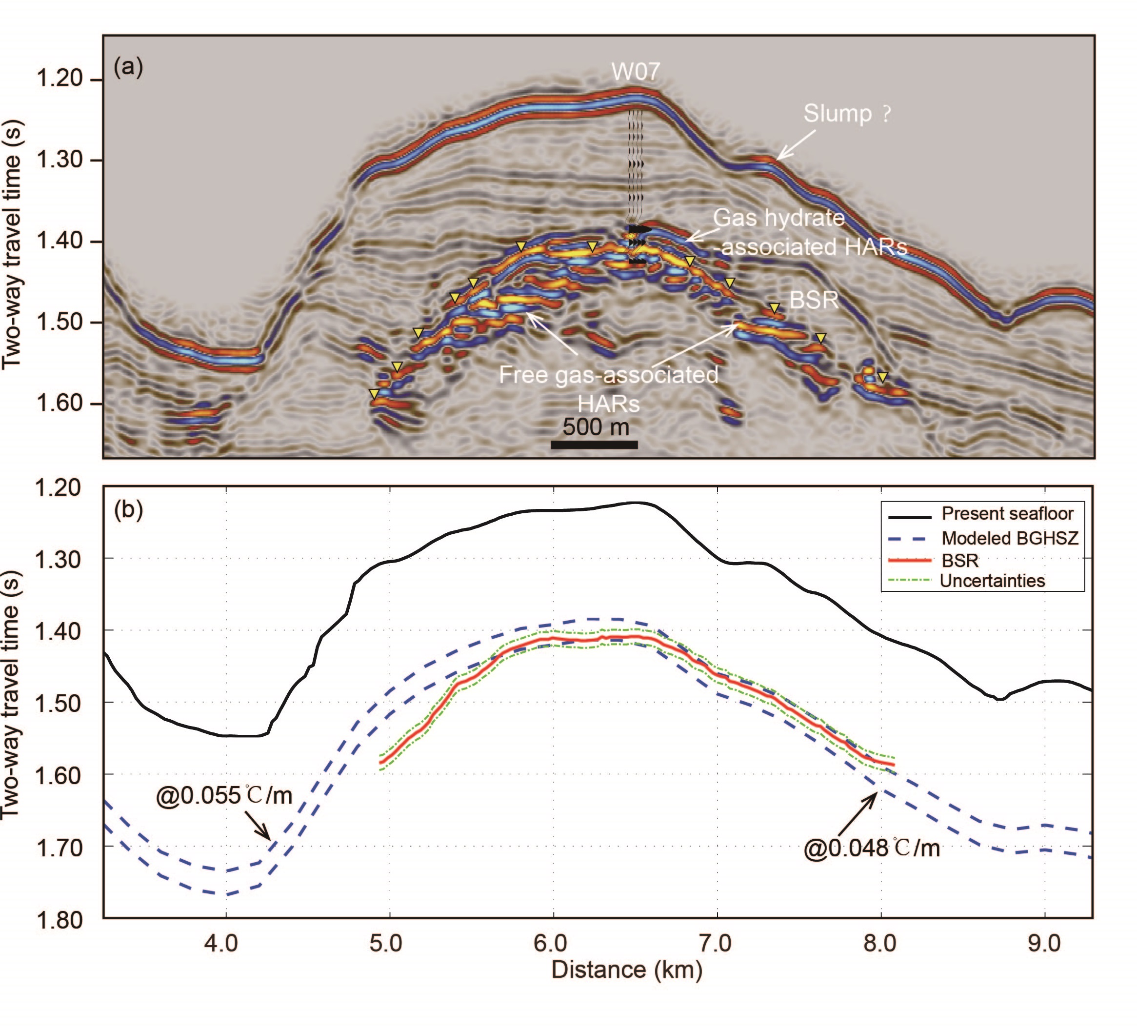 1 a)高分辨地震剖面指示天然氣水合物及游離氣分布特征 b) 地震剖面上解釋的BSR分布與理論計算的水合物穩定帶底的對比