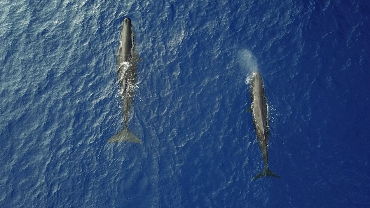 值得一提的是,科考隊員們曾多次觀察到抹香鯨和其它鯨類(弗氏海豚)混游的奇特現象。在蔚藍的海面上,幾頭海洋巨獸抹香鯨(體長十幾米,體重幾十噸)被數十頭小迷弟弗氏海豚(2至3米長,體重僅幾百公斤)所環繞追隨,抹香鯨高達數米的噴氣柱與弗氏海豚快速游動激起的浪花形成強烈的視覺反差。這種奇妙的場景立馬引發了科考隊員的熱烈討論,有人認為“蹭吃假說”可以解釋這種現象,因為弗氏海豚跟著抹香鯨有可能不勞而獲,撿吃漏網之魚,畢竟抹香鯨食量驚人,飽餐之后所剩殘羹也夠一群海豚大快朵頤。也有人認為這種混游現象是弗氏海豚的一種社會寄生、尋求庇護的行為,即弗氏海豚對抹香鯨有某種“小弟崇拜大哥”的依附感,通過追隨抹香鯨以獲得庇護、躲避天敵。接下來,科研人員將對相關科考數據進行分析,開展社會行為學研究,對解釋鯨豚混游現象的不同猜想進行驗證。
