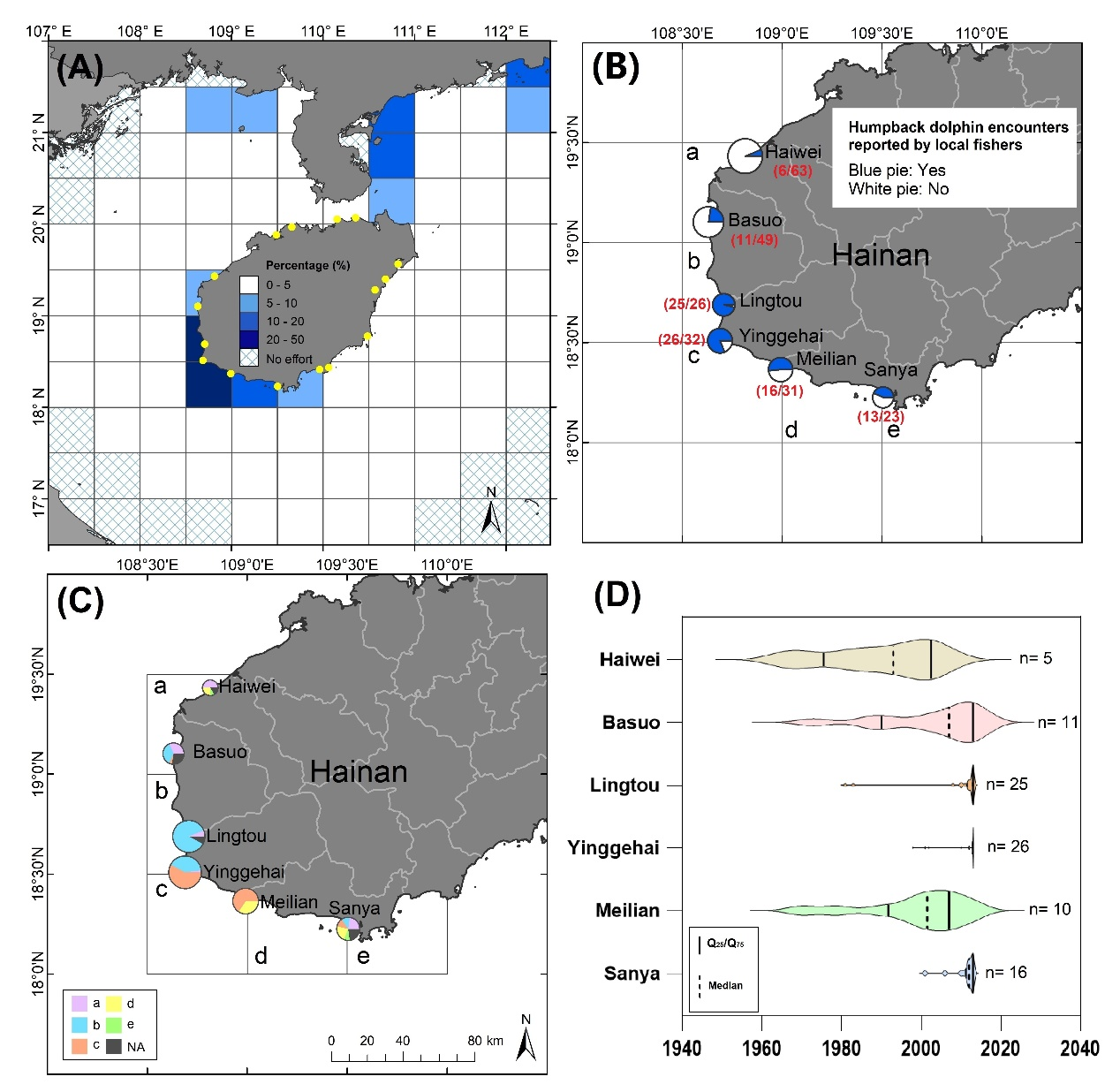 經過全世界范圍內的鯨類科研人員幾十年的不斷發展和完善,漁民問卷調查、船基目視調查和被動聲學監測都已逐漸成為非常重要的鯨類調查技術手段,而且被廣泛運用于各種類型的鯨類生態和保護研究項目。盡管如此,這些方法都有各自的使用條件、范圍、要求和局限性,這就導致單一方法所獲得的調查結果往往難以驗證其可靠程度。尤其應當注意的是,全球還有很多類似中國這樣的許多欠發達的國家/地區,其共性是鯨類本底資料通常十分匱乏。此外,由于研究和保育資金支持非常有限,欠發達國家/地區的鯨類科研人員和保護工作者難以直接開展有針對性、大范圍、長期、系統的野外實地調查和監測。深海所研究團隊首次將漁民問卷調查、船基目視調查和被動聲學監測這三種技術方法組合,以海南中華白海豚的發現、驗證和長期監測為示范,展示了中華白海豚在海南西南部的出沒分布及棲息地利用情況。相關的研究結果不僅為保護海南中華白海豚提供了基本的信息和資料,成為海南近海生態和珍稀動物保護的重要科學支撐,而且形成了一套循序漸進的、相互印證的、互相補充的整合式鯨類生態研究新范式,為全世界的鯨類科研人員提供了重要的示范參考,以便于在數據缺乏的水域更高效地開展鯨類生態和保護研究工作。