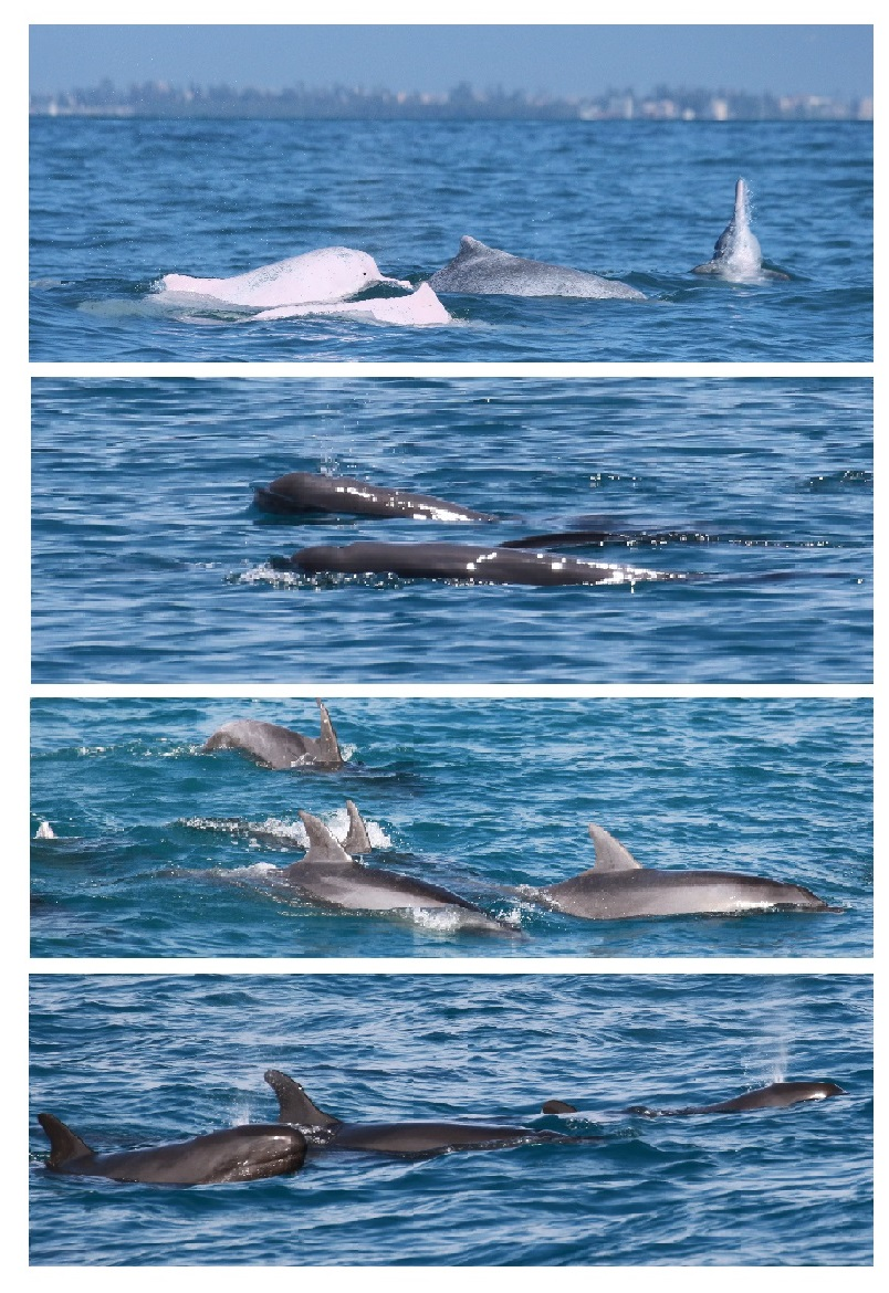 圖2. 研究團隊在海南西南近岸水域目擊的四種鯨類物種:中華白海豚、印太江豚、印太瓶鼻海豚和偽虎鯨(圖片來源:深海所研究團隊)