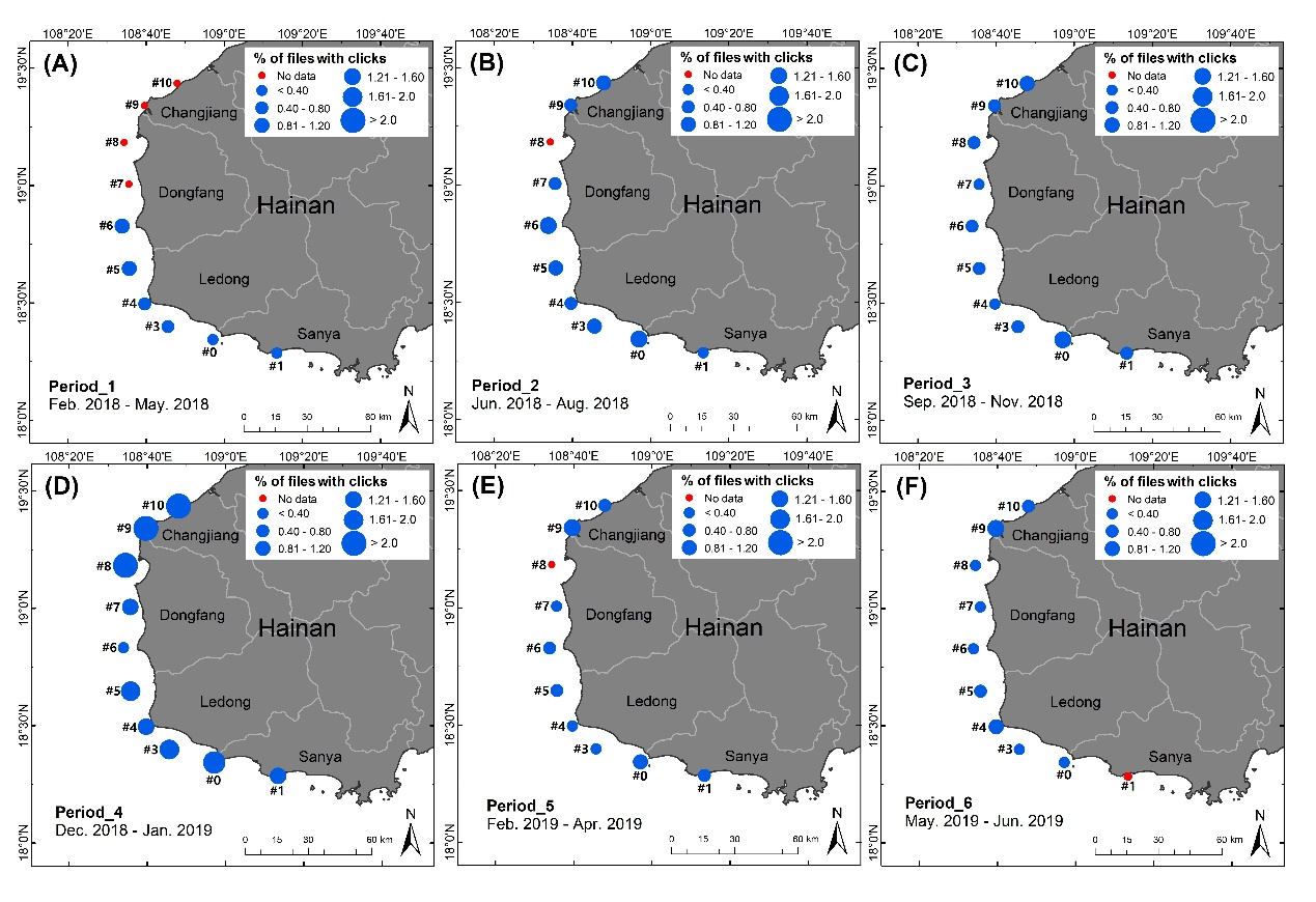 圖4. 海南西南近岸水域海豚clicks信號的被動聲學監測情況(2018.2-2019.6被動聲學監測結果)
