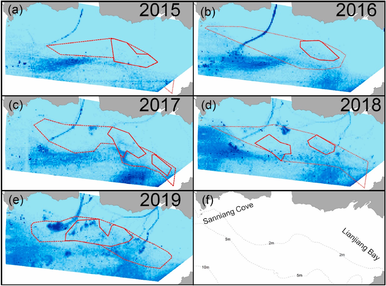 圖1. a-e展示2015-2019年大風江口水域船舶活動;f展示三娘灣、廉江灣位置