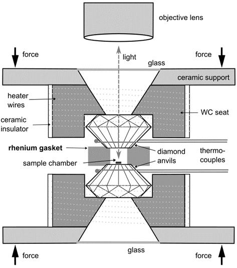 圖1. 熱液金剛石壓腔示意圖。其中,rhenium gasket為錸墊片,其內(nèi)孔用于密封樣品。
