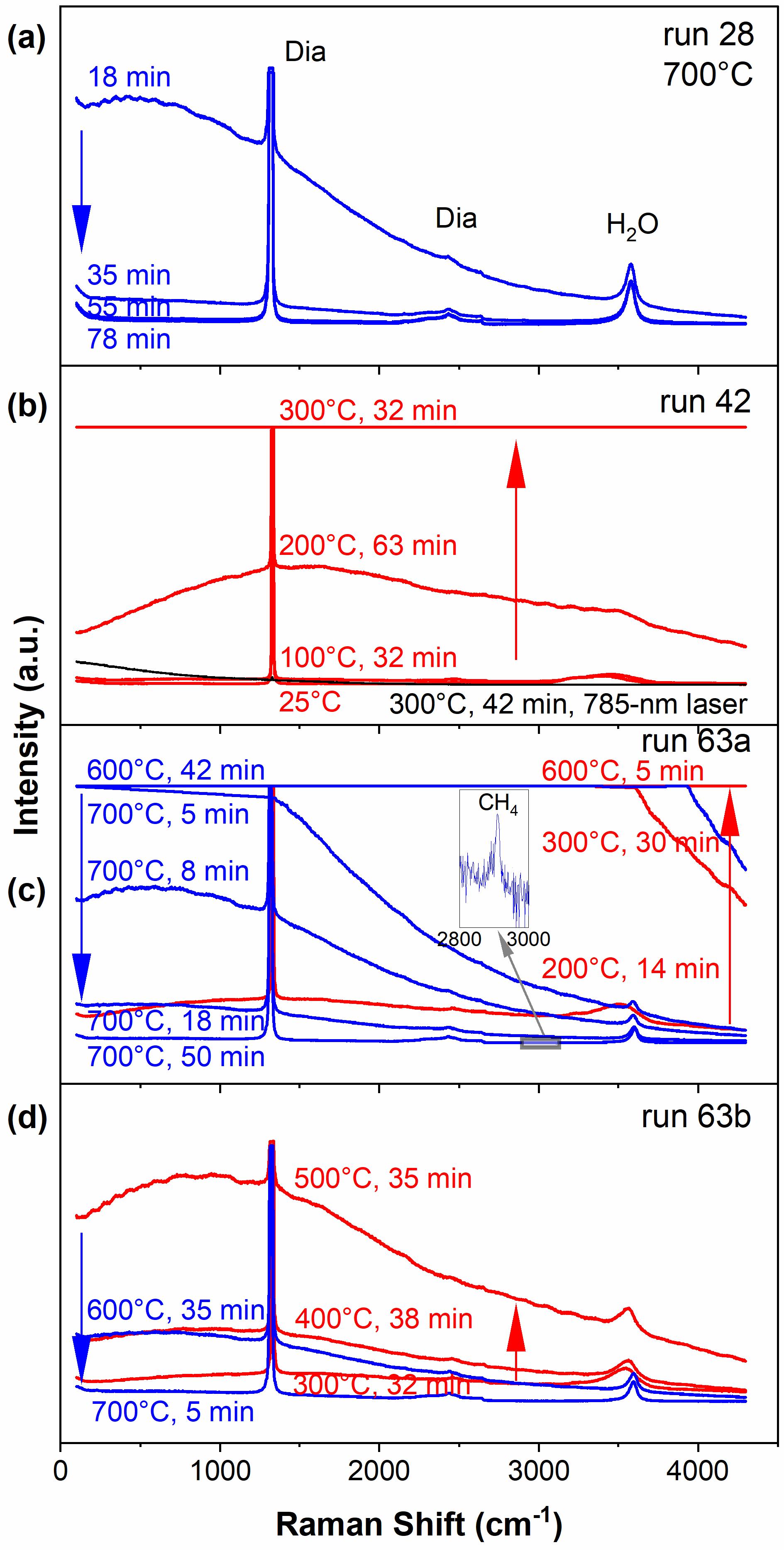 圖2. 在純水體系HDAC內(nèi)流體拉曼熒光隨著溫度和時(shí)間的變化。a、b、c指示,背底熒光在200℃明顯升起,在300–600℃超過檢測限,在700℃漸退。d實(shí)驗(yàn)使用的是c實(shí)驗(yàn)結(jié)束后的墊片,表明預(yù)熱可明顯減少熒光的強(qiáng)度和溫度范圍。