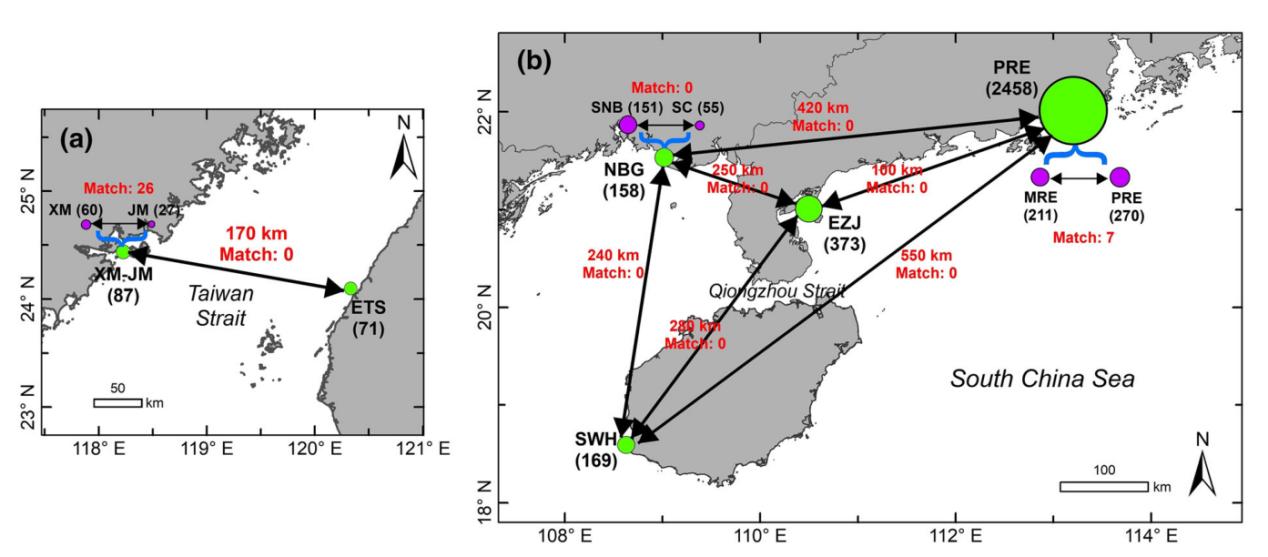 圖2 不同中華白海豚種群/亞種群的照片識別交叉比對結(jié)果示意圖:(a)廈門-金門和臺灣西海岸種群;(b) 海南西南部、湛江東部、北部灣和珠江口-漠陽江口種群。括號中的數(shù)字表示各區(qū)域已識別個體數(shù)量
