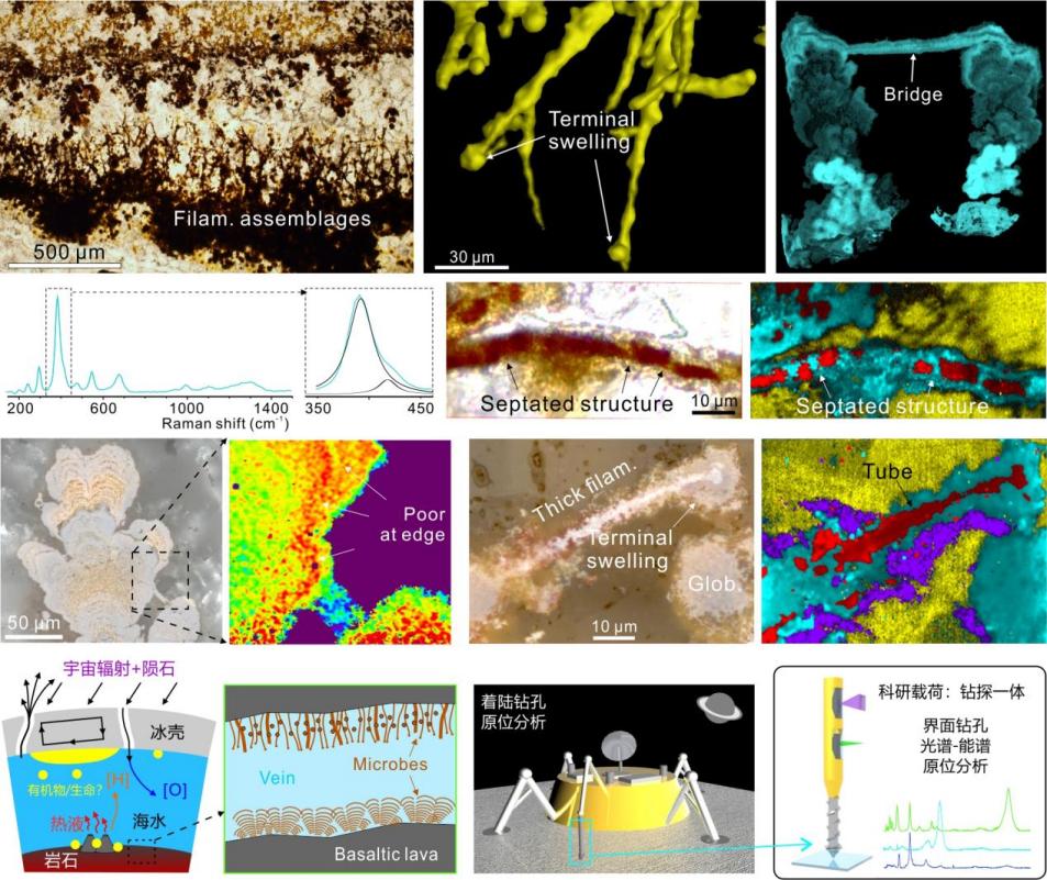 第1-3行:鐵質(zhì)微體化石可見光、顯微CT與拉曼光譜圖;第4行:地外海洋水-巖界面潛在微生物與著陸器載荷示意圖
