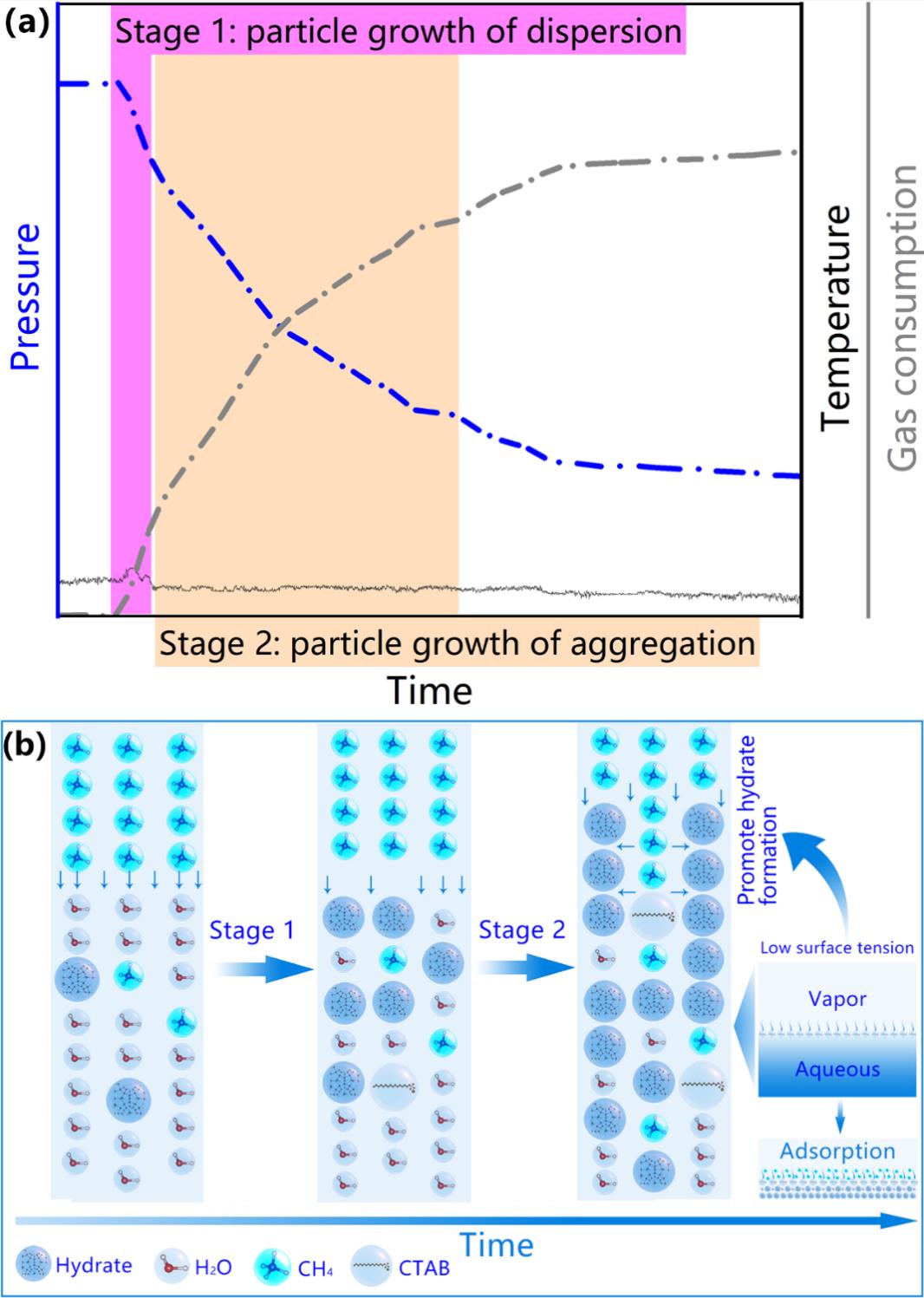 結合微觀與宏觀尺度的實驗結果,該研究總結出兩階段水合物生長模式,第一階段為顆粒分散生長過程;第二階段為顆粒聚集生長過程(圖2)。研究論文“Thermodynamic and Kinetic Study of Methane Hydrate Formation in Surfactant Solutions: From Macroscale to Microscale”發表于國際學術期刊《Energy》,博士研究生孫既粵為論文的第一作者,蔣磊研究員為通訊作者。