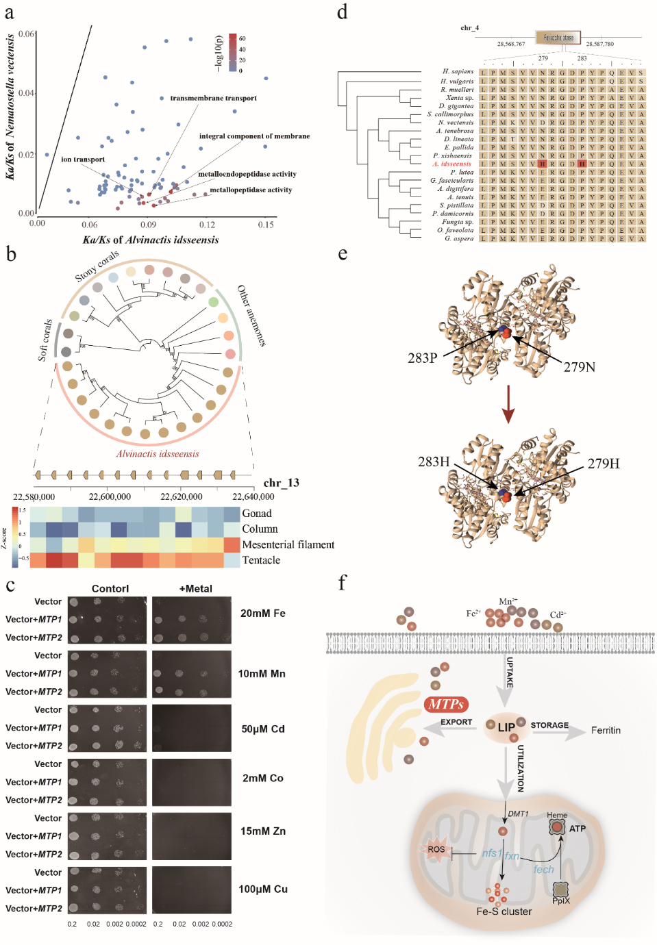 研究團隊通過比較基因組分析發現,該海葵基因組中分別有736/31個基因家族顯著擴增/收縮。擴增基因家族主要與金屬離子的結合、細胞膜和應激反應相關,其中與金屬離子耐受相關的MTPs基因家族顯著擴張,轉錄組分析發現大多數MTP基因主要在觸手中表達。由于MTP基因在無脊椎動物中研究較少,為了更好地了解MTPs的功能,研究人員利用酵母表達系統對其進行功能驗證,結果發現攜帶MTP的酵母細胞只能在含有高濃度Fe2+和Mn2+的培養基中生長,這證明MTP可以幫助該海葵耐受Edmond熱液口環境中高濃度的Fe2+和Mn2+。