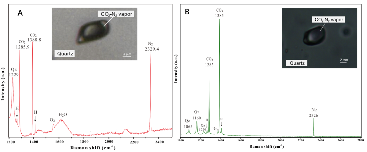 圖1.?人工合成CO2-N2-H2O包裹體(A)和天然CO2-N2包裹體(B)的拉曼光譜圖。Qz = Quartz; H = Hot band of CO2;?O2: in the air.