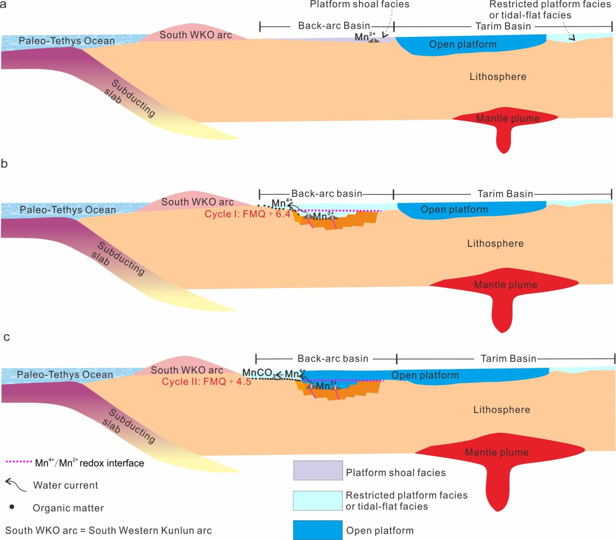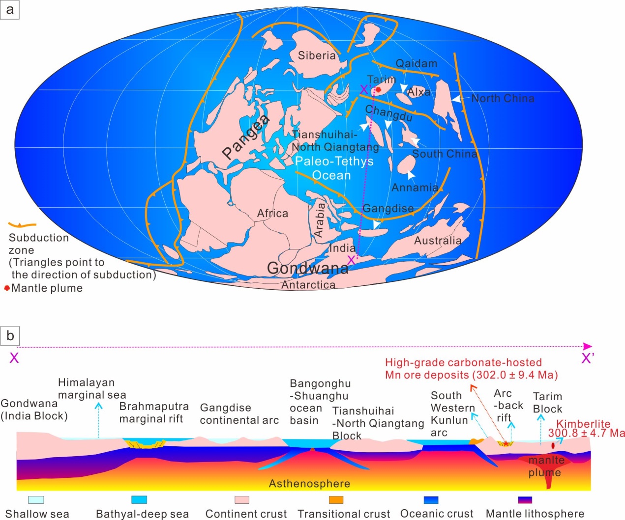 奧爾托喀訥什大型碳酸鹽型錳礦形成于古特斯洋向北俯沖的弧后盆地環(huán)境,本次工作通過新鮮錳礦石有機(jī)質(zhì)的Re-Os定年顯示其成礦時(shí)代為302 ± 9 Ma,是晚石炭世期間世界上第一個(gè)被發(fā)現(xiàn)的高品位菱錳礦礦床。該時(shí)期柴達(dá)木、華北板塊均存在古特斯洋向北俯沖的弧后盆地環(huán)境(圖2a),但卻未有菱錳礦床的發(fā)現(xiàn)。研究推測:塔里木地幔柱的活動(dòng)促進(jìn)了西昆侖菱錳礦礦床的形成(圖2a)。原因在于:(1)錳礦成礦時(shí)代與其北部塔里木地幔柱啟動(dòng)時(shí)間一致(塔里木金伯利巖年齡300.5 ± 4.4 Ma被認(rèn)為是地幔柱啟動(dòng)時(shí)間(Zhang et al., 2013)(圖2b);(2)Re-Os同位素顯示礦區(qū)有地幔物質(zhì)參與;(3)西昆侖北部存在塔里木地幔柱,西昆侖南部的北羌塘地體(圖2a)在早二疊紀(jì)也有地幔柱活動(dòng)(Zhang and Zhang, 2017), 故夾在中間的西昆侖地區(qū)也應(yīng)受到地幔柱的影響。礦區(qū)存在強(qiáng)烈的熱水沉積活動(dòng),可能地幔柱影響下的弧后盆地的熱水活動(dòng),提供了錳源。