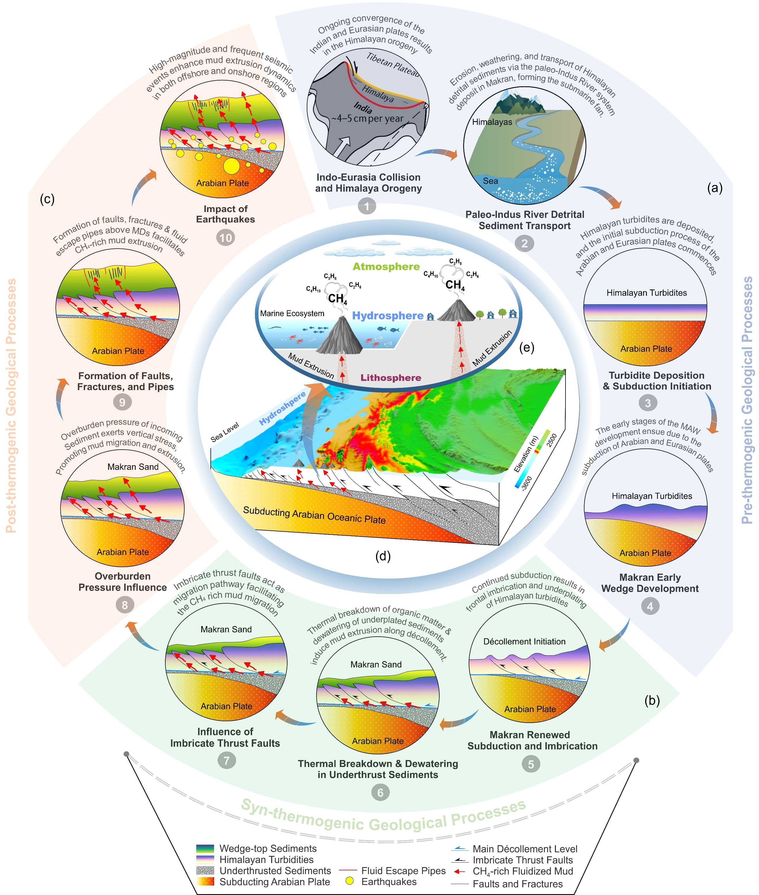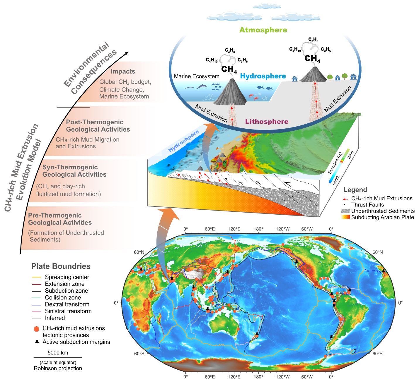 近日,中國科學院深??茖W與工程研究所海洋地球物理與資源實驗室的吳時國研究員指導的博士生Umair Khan與北京科技大學的合作者在期刊《Geoscience Frontiers》上發(fā)表了一篇題為《Geochemical Cycling, Tectonic Drivers and Environmental Impacts of CH4-Rich Mud Extrusions in Subduction Zones》的論文。