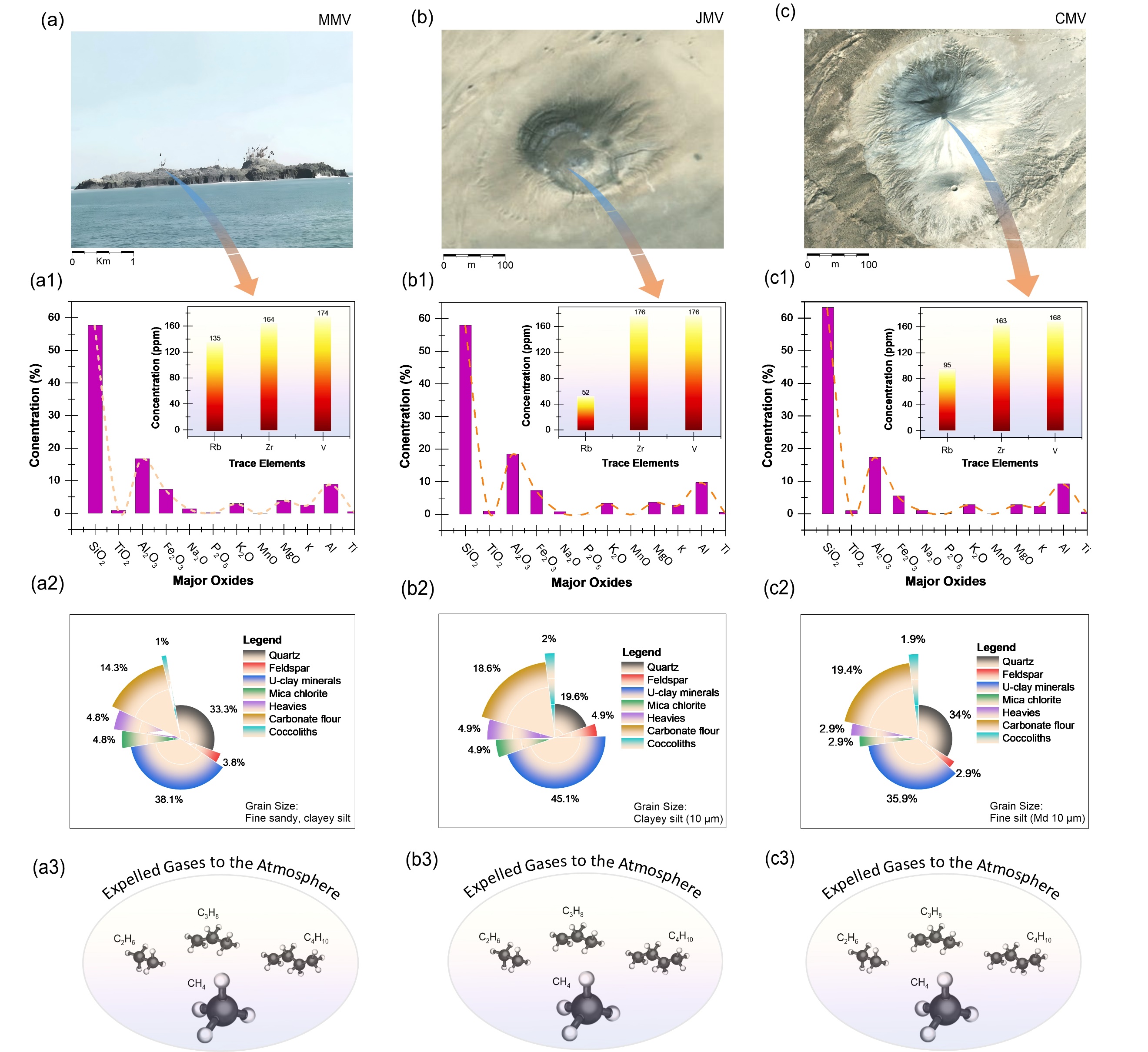 俯沖帶是巖石圈揮發(fā)物流通的關鍵界面,復雜的構造和地球化學相互作用促進了地殼深部儲層中氣體和流體的釋放。泥火山活動作為這些過程的動態(tài)表現,貢獻了CH?排放,影響了全球CH?預算并對海洋生態(tài)系統(tǒng)產生影響。全球范圍內,約2000處泥火山位于俯沖帶,突顯了俯沖相關的地球化學和構造過程在促進CH?向大氣和水圈排放中的重要性。 近年來,遙感技術(合成孔徑雷達干涉測量、航空攝影、機載激光掃描)與水聲學方法的協(xié)同應用,系統(tǒng)刻畫了陸域與海域富CH?泥火山的三維幾何形態(tài)與空間分布特征。氣相色譜、同位素分析、原位氣體通量測量以及噴出的泥火山氣體與流化泥漿的地球化學分析進一步推進了對分子組成、同位素特征和再循環(huán)組分化學性質的研究。此外,深海鉆探和搭載CH?傳感器的潛水器為噴發(fā)活動、揮發(fā)性排放及潛在危害提供了新的見解。
