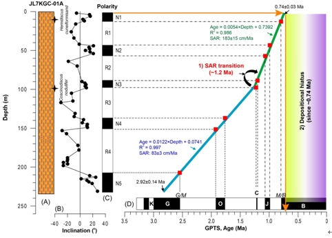 圖2 A,鉆孔巖性變化簡圖;B,磁傾角變化;C,鉆孔磁極性柱;D,國際標準磁極性柱。兩個主要發(fā)現(xiàn)是:1)沉積速率(SAR)的轉換;2)中更新世以來的沉積間斷。