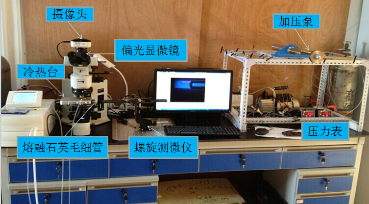 該實驗室利用已具備的技術條件,通過購買實驗平臺所需的設備和材料自行搭建組裝,于2014年9月,在周義明研究員的指導下完成了深淵水體、熱液及冷泉環境模擬實驗平臺的搭建,目前已投入使用。在現有設備條件下,計劃開展不同地質流體的飽和蒸汽壓觀測實驗。在毛細管內運用汞封技術制備封閉待測樣品,并與控溫、加壓系統相連接,在體視鏡下實現對不同地質流體飽和蒸汽壓的觀測。