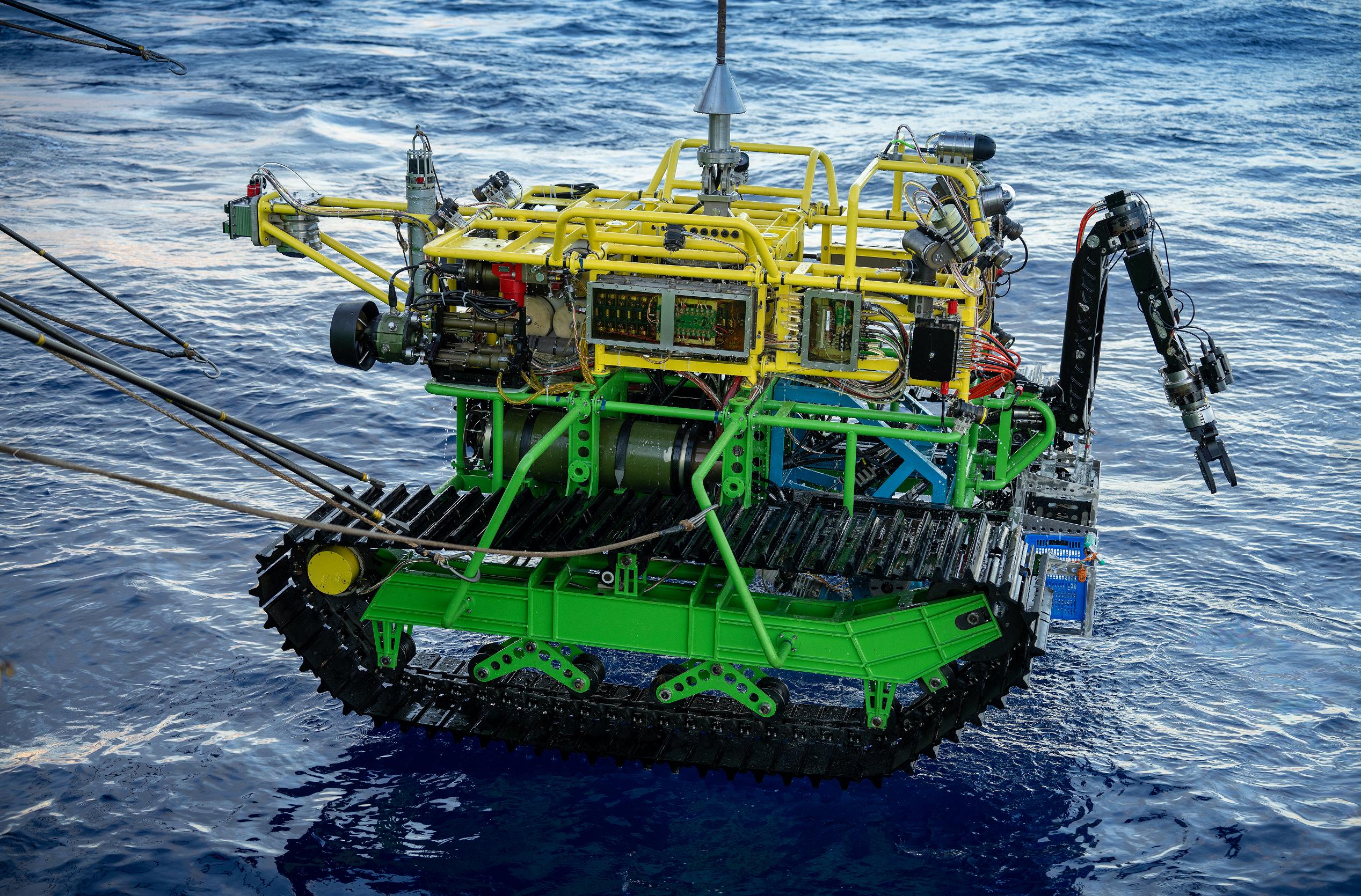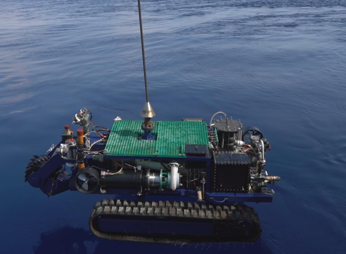 深海富鈷結殼規模采樣車設計深度4500m,裝置長4.3m,寬2.3m,高1.6m,空氣中重量4.1噸,水中重量3.0噸,裝機容量80kW,每小時完成500kg富鈷結殼礦物的剝離、破碎和收集。該裝置于2018年4月在南海海域2500m水深開展了海上試驗,并獲取富鈷結殼礦石樣品,驗證了深海富鈷結殼采樣裝置的作業功能,包括布放回收時自動定向功能、海底行走功能、海底礦石破碎收集功能力,在極端復雜海底地形中具備作業能力。