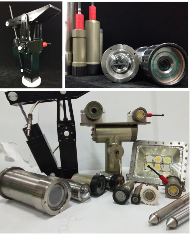 在開發大型深海資源開發裝備的同時,為解決許多深海常用元器件依賴進口,成本高,周期長等現象,自主研發多種深海常用的元器件,包括照明燈、閃光燈,模擬攝像機、網絡攝像機、SDI攝像機、高清相機、云臺、旋轉編碼器、磁控開關、鋰電池池等,這些元器件安裝在深海裝備上,經過多次深海試驗驗證,完全可以取代國外進口裝備,部分元器件的最大工作水深達到11000米。下圖中是目前研發的多種深海通用元器件。